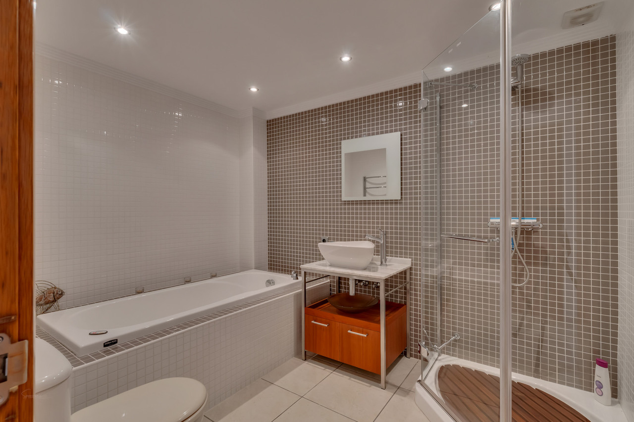 Double bedroom with sea views, en-suite bathroom (bath and shower), and fitted