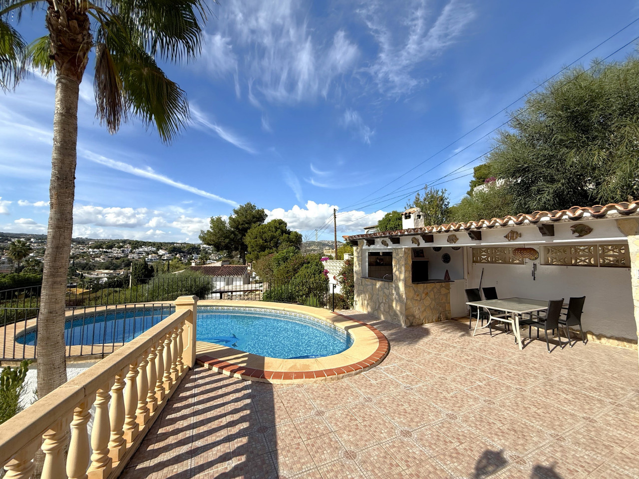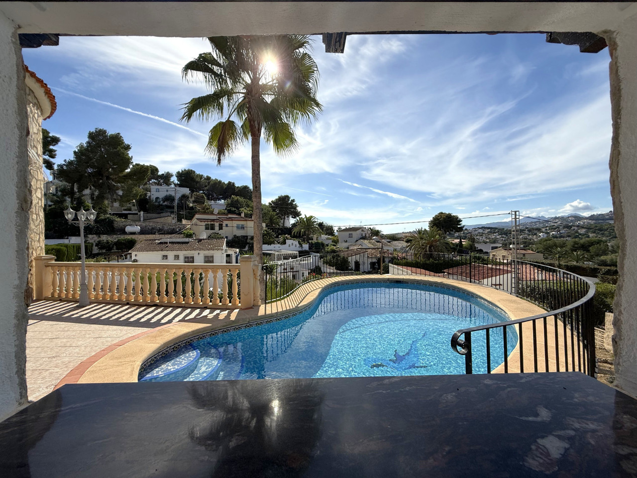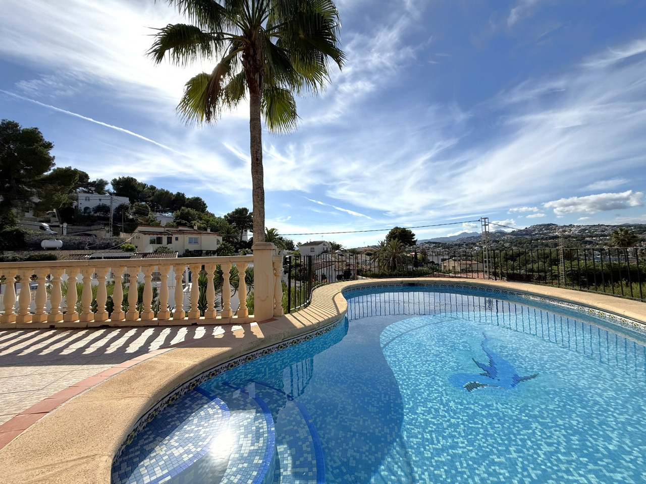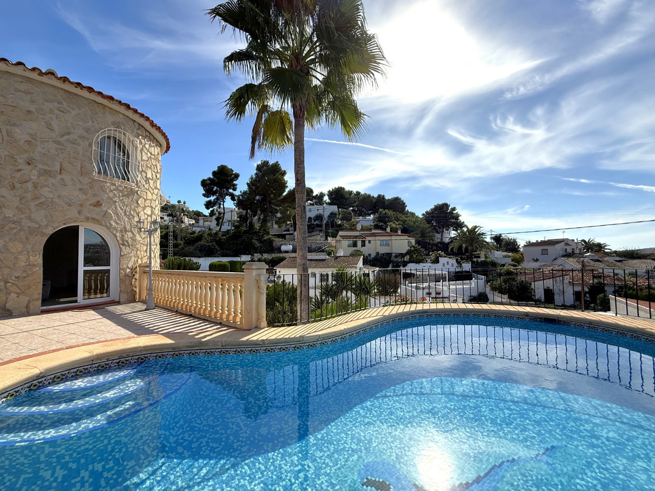 This very well maintained Mediterranean style villa with heated pool and garage is located in Valle del Portet on the outskirts of Moraira, just a short drive to the b…