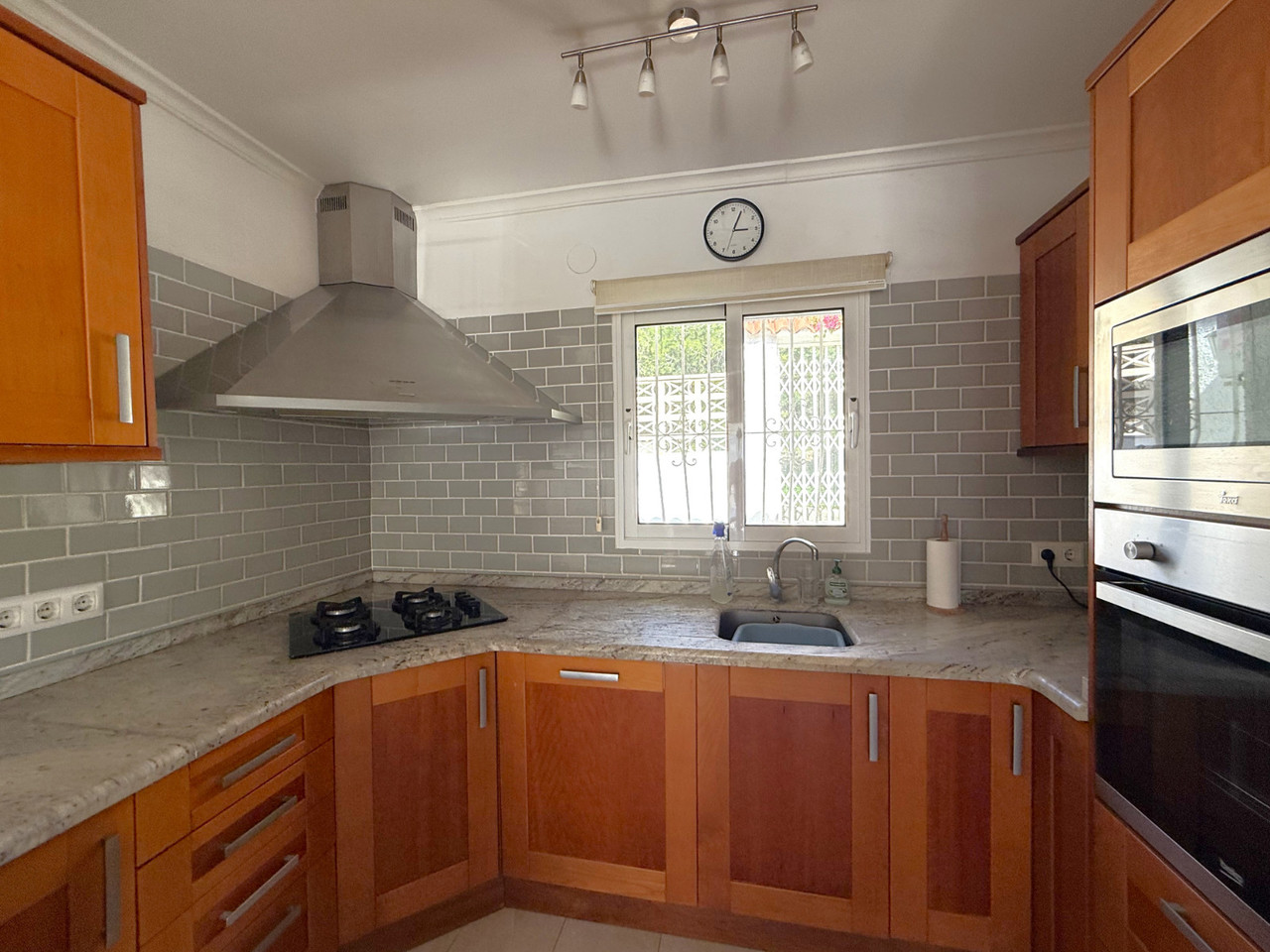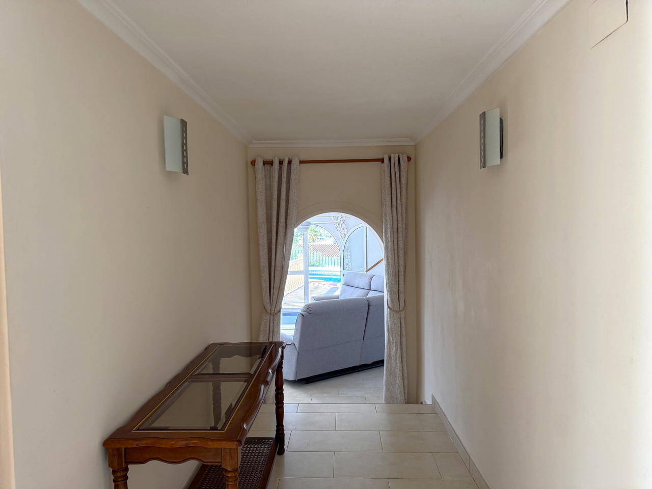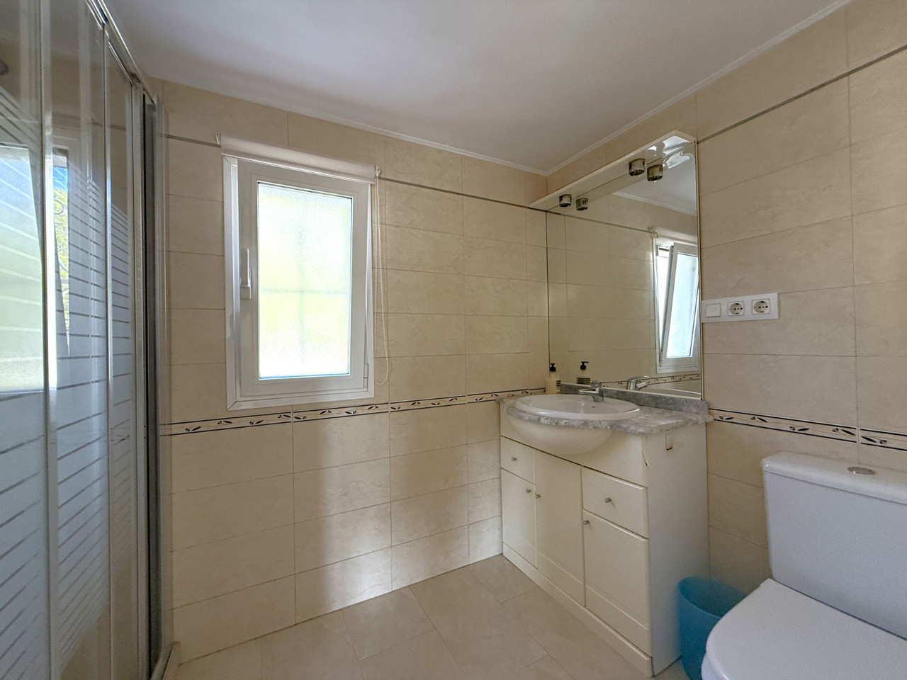 Upon entering the property, on the main floor to the right you’ll find a spacious open-plan kitchen that connects with the dining area on the left. Next to the dining room, there is a small room that can be used as an office or an additional bedroom. Continuing down the hallway, there are two bedrooms, one on each side, each with its own bathroom. At the end of the hallway is the large, bright living room with direct access to the terrace and pool. From the living room, stairs lead up to the upper floor, where you find a generous bedroom with an en-suite bathroom. Back on the main level, the terrace area offers a pleasant covered naya with an outdoor kitchen area, a kidney-shaped pool, and open views. The plot is spacious and features a lovely garden with fruit trees. The house is equipped with central heating, air conditioning, and a large parking area. Its convenient location allows you to walk to supermarkets and restaurants, offering both comfort and tranquility in an ideal setting.