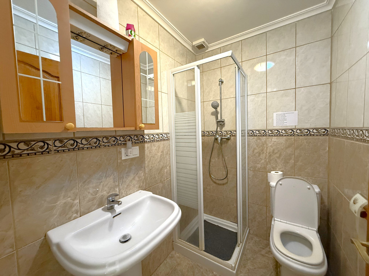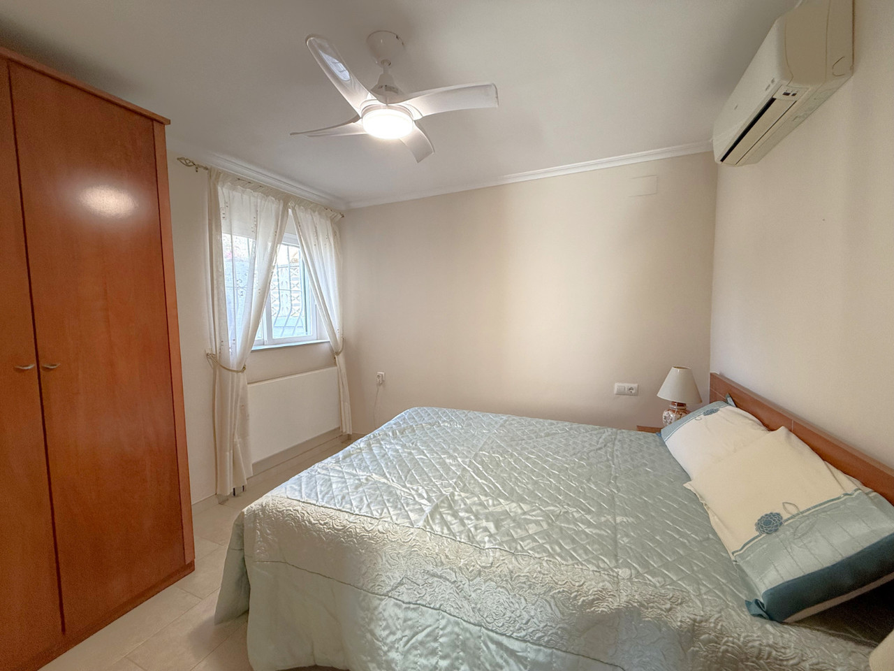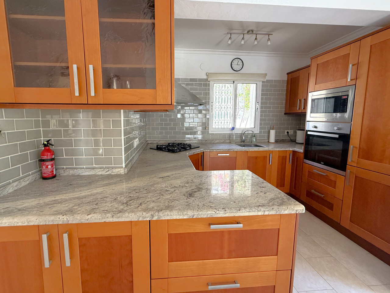 Upon entering the property, on the main floor to the right you’ll find a spacious open-plan kitchen that connects with the dining area on the left. Next to the dining room, there is a small room that can be used as an office or an additional bedroom. Continuing down the hallway, there are two bedrooms, one on each side, each with its own bathroom. At the end of the hallway is the large, bright living room with direct access to the terrace and pool. From the living room, stairs lead up to the upper floor, where you find a generous bedroom with an en-suite bathroom. Back on the main level, the terrace area offers a pleasant covered naya with an outdoor kitchen area, a kidney-shaped pool, and open views. The plot is spacious and features a lovely garden with fruit trees. The house is equipped with central heating, air conditioning, and a large parking area. Its convenient location allows you to walk to supermarkets and restaurants, offering both comfort and tranquility in an ideal setting.