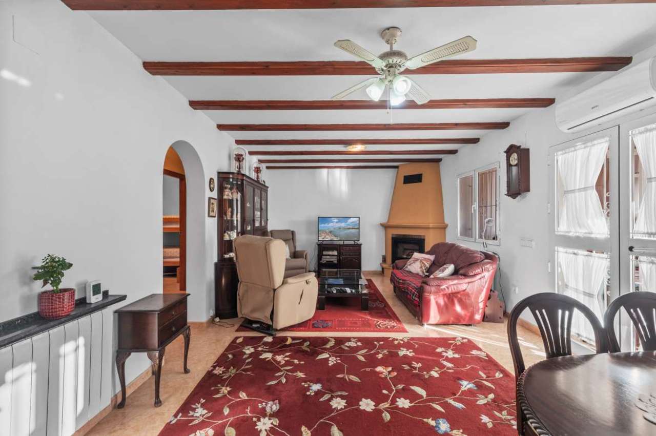 Set in a peaceful residential environment, this charming home enjoys an excellent balance between tranquility and convenience. Within just a few minutes’ drive, you can reach beautiful sandy beaches, seaside coves, lively bars and restaurants, supermarkets, and international schools. The area is ideal both as a holiday retreat and for year-round living, thanks to its calm surroundings, good infrastructure, and easy access to all daily amenities. Built in 1998, the property is arranged on one single level, offering comfortable and practical living. A welcoming covered terrace leads into a bright living room with a fireplace, creating a warm and inviting atmosphere throughout the year. The separate kitchen is functional and well connected to the living space. The night area consists of two bedrooms, a shared bathroom, and a master bedroom with an en-suite bathroom, providing privacy and comfort for family and guests alike. The house is built with a basement layer to prevent humidity, ensuring durability and a healthy indoor climate. It is equipped with gas central heating and an electric water boiler, making it suitable for all seasons. Outside, the property features a low-maintenance garden, perfect for relaxed Mediterranean living. There is parking space for several cars, a double garage, as well as a laundry room and storage room, adding practicality to everyday life. With its south-facing orientation, the house enjoys sunshine throughout the entire day, filling the interiors with natural light and creating a bright, positive living environment. A solid, well-maintained home that offers comfort, sun, and an excellent lifestyle — whether as a permanent residence or a holiday escape on the Costa Blanca.