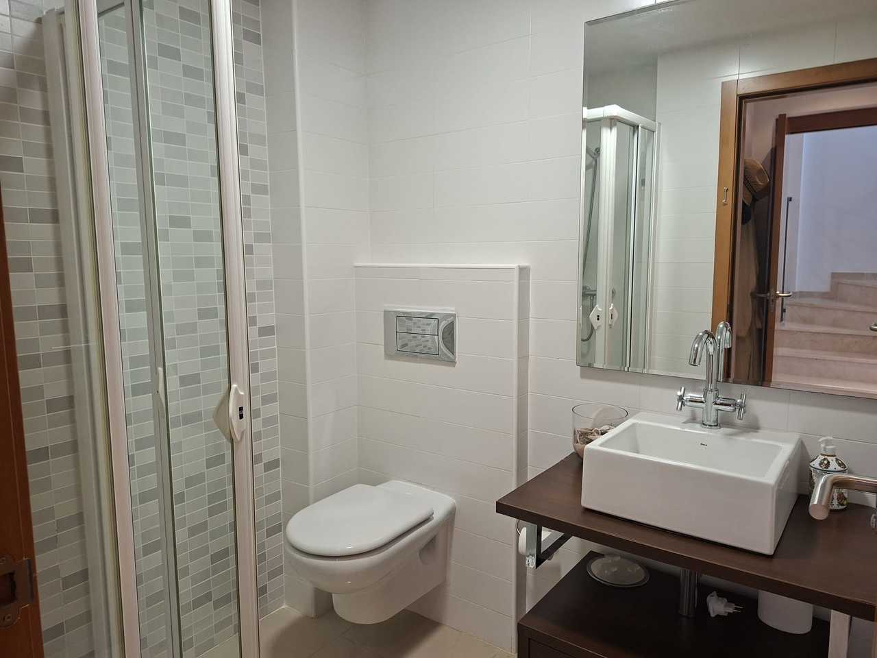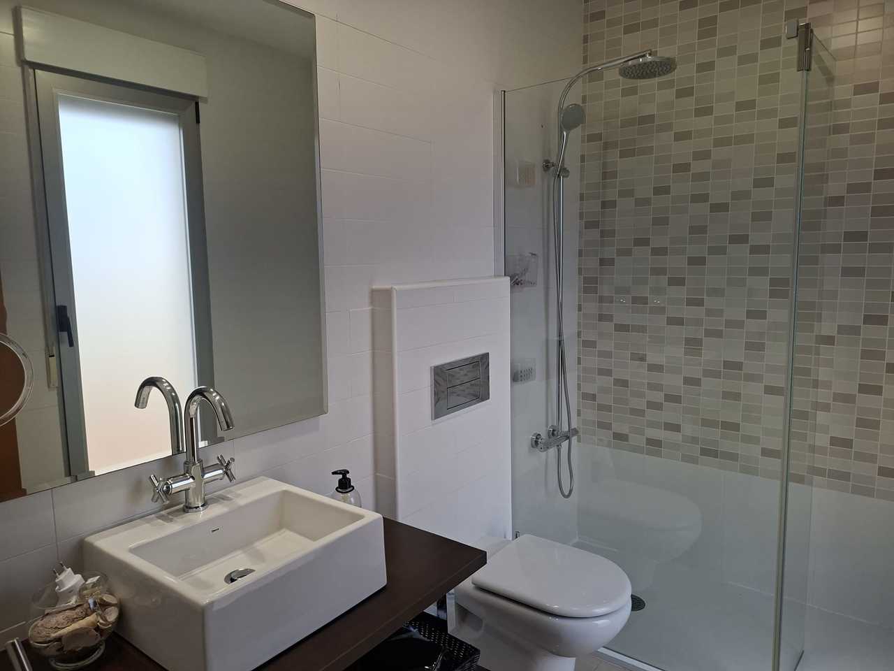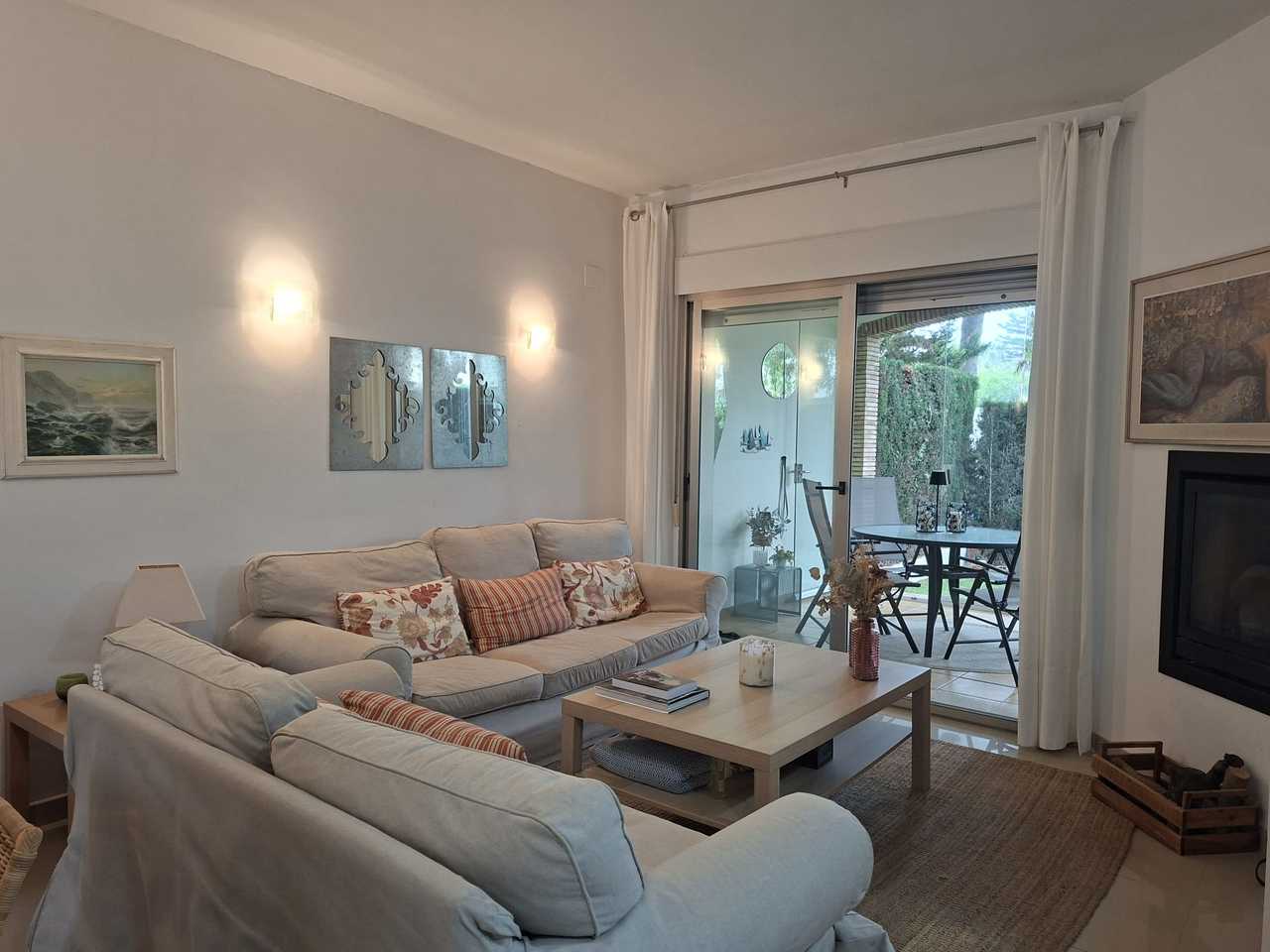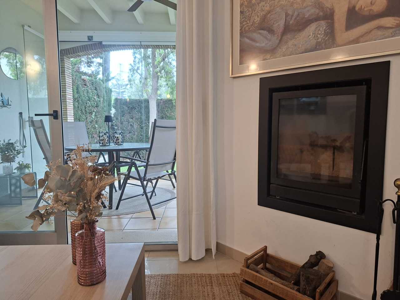 On the main floor, there is a bedroom and an en-suite bathroom with a shower, ideal for added convenience. The open-plan kitchen is fully equipped. The living and dining room, with a cozy wood-burning fireplace, has direct access to a covered terrace enclosed by folding glass windows and an awning, perfect for enjoying any time of year. The private garden, with high-quality, maintenance-free artificial grass, provides access to the common areas, where you can relax by the communal pool or sunbathe.